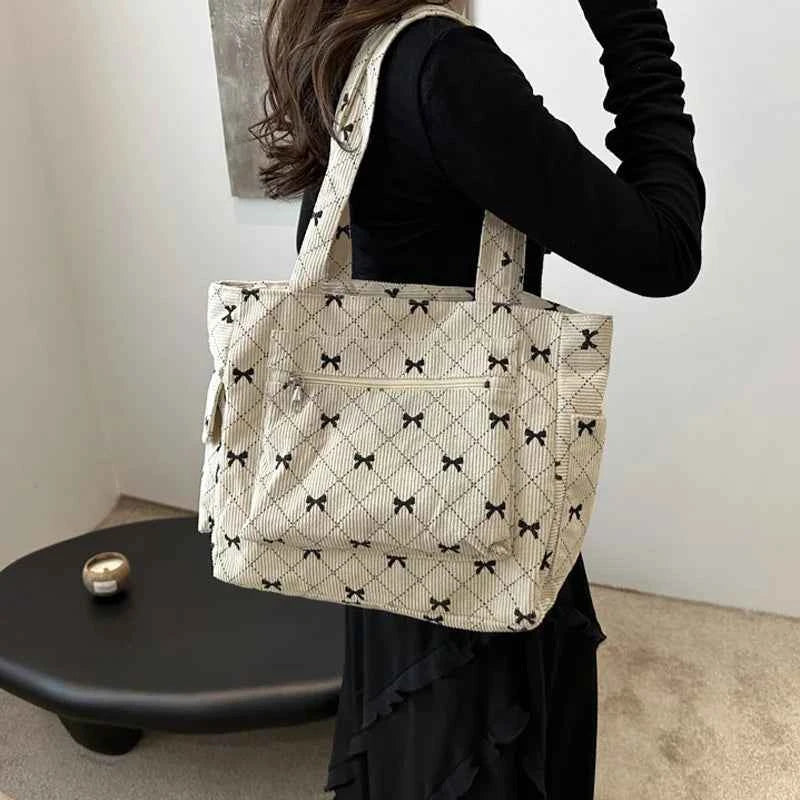 This ribbed tote bag features a charming all-over bow motif, blending playful detail with a relaxed silhouette. Its textured surface enhances visual depth, while the spacious interior accommodates everything from books to daily essentials. With a front pocket for easy access to small items, this tote proves that casual can be both functional and stylish.